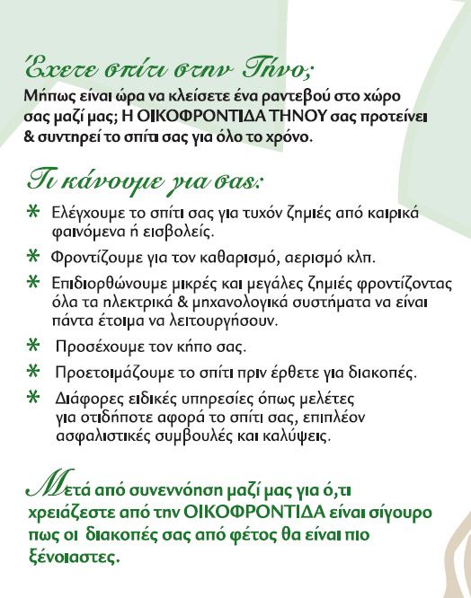 Διαχείριση Ακινήτων "Οικοφροντίδα" Παναγιώτης Αλικάρης Ζαν.Αλαβάνου 12 - Τήνος Τηλ: 22830-25555 Κιν: 6974835686 email: tripotam@hol.gr